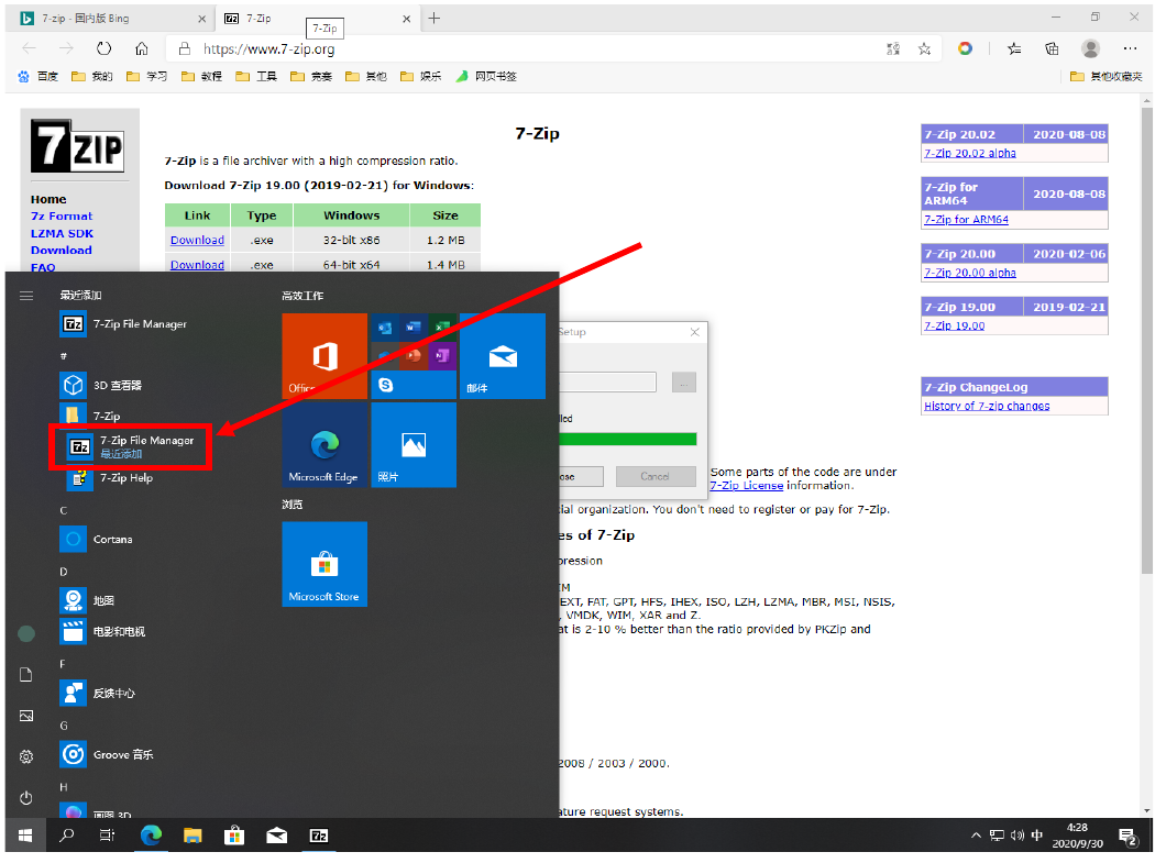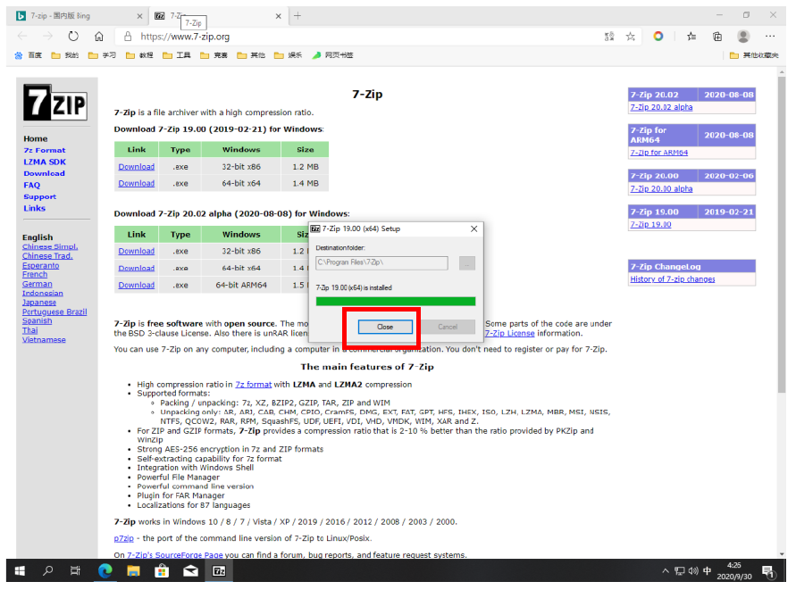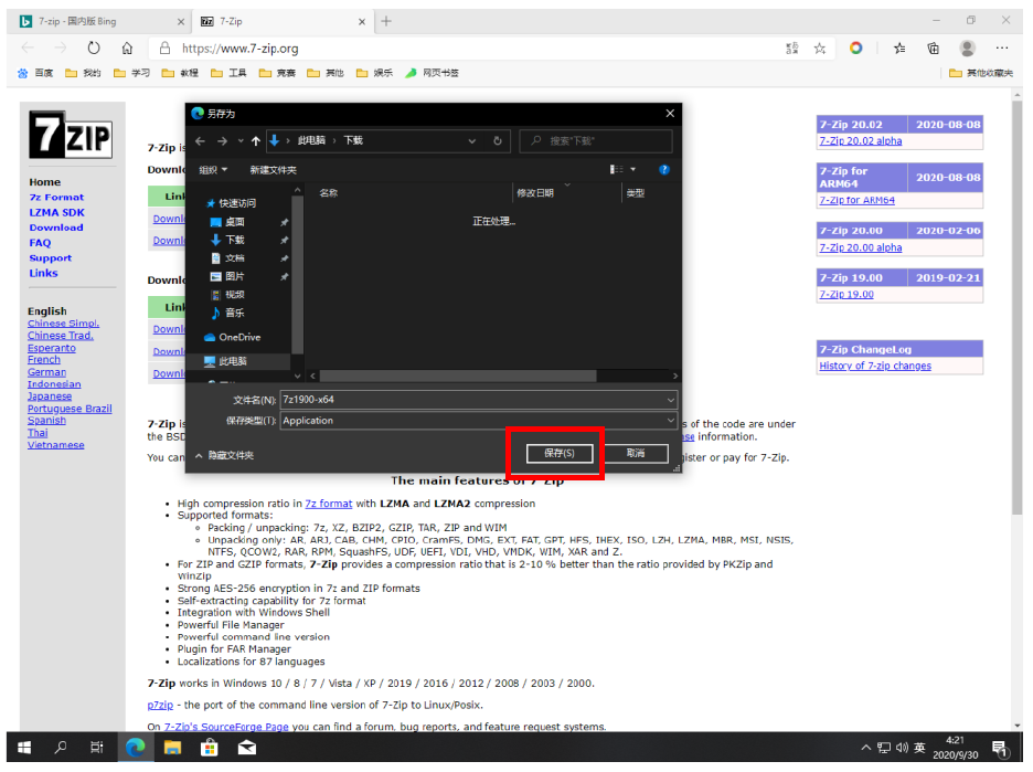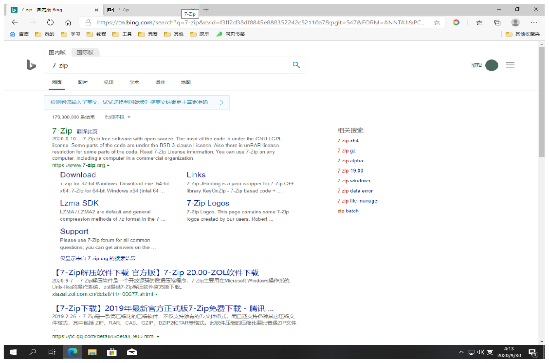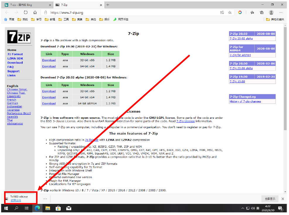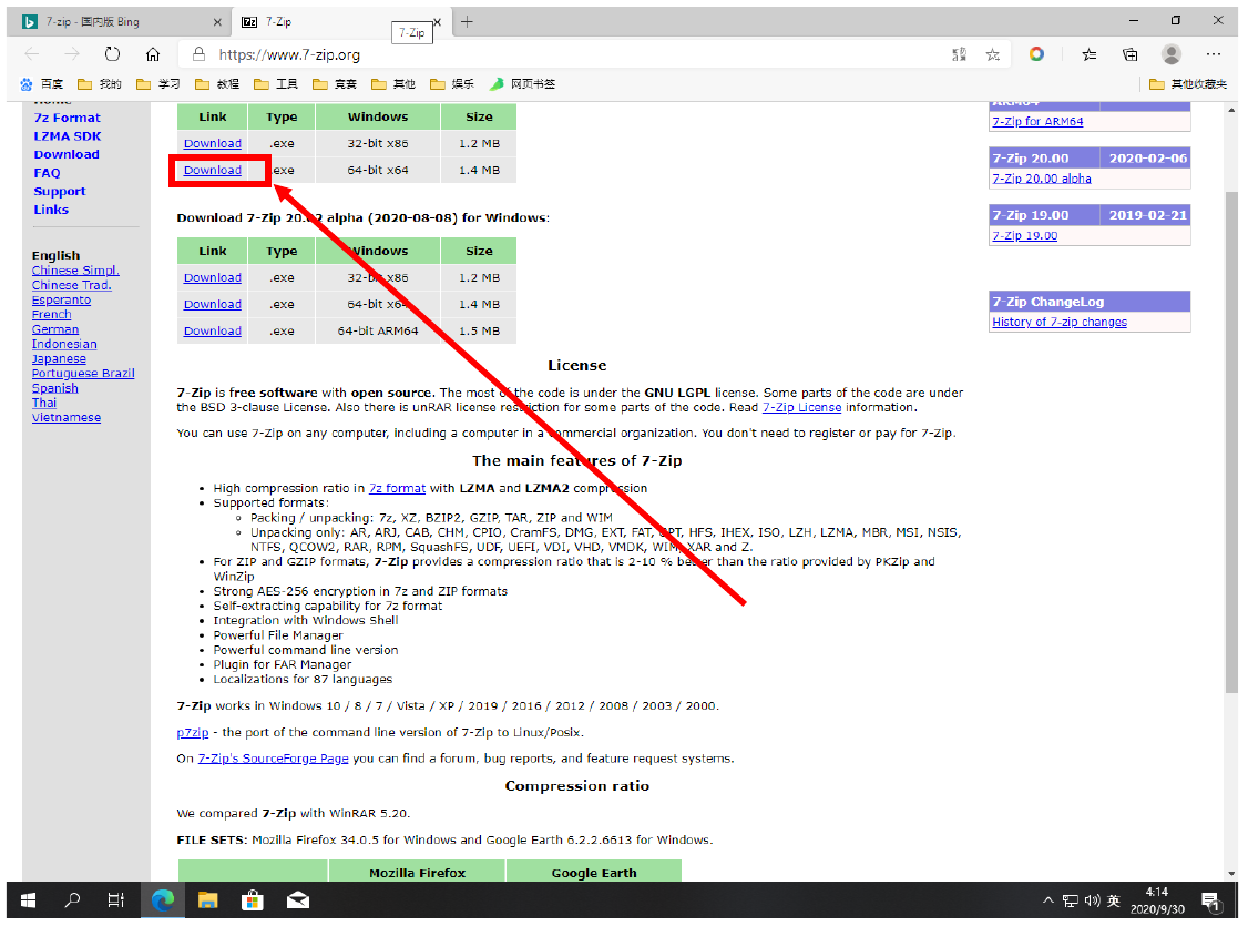 2.1.2 点击第一个搜索结果,进入官网之后(www.7-zip.org),点击红框中的链 接下载 64 位正式版。